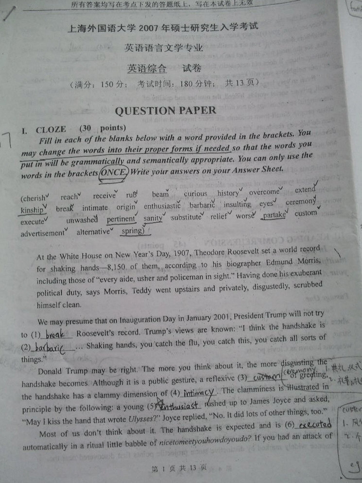 当前位置:考研云分享 专业课真题 2007年上海外国语大学英语语言文学专业英语综合考研真题 附件 文件名: 2007年上海外国语大学英语语言文学专业英语综合考研真题.docx 大小: 2.25MB 文件类型: .docx 前往下载 附件购买 售价:98 积分 开通会员或更高级的会员可免费下载该文件 您还未登录,请登录后查看资料 登录 上海外国语大学英语 上海外国语大学 英语 免责声明:本站所有的内容均来源于互联网采集或网友投稿提供,不能保证内容的真实性、完整性,仅供个人研究、交流学习使用,不涉及任何商业盈利目的。如果资料有误与官方发布不一致,请与官方最新发布为准,请联系本站管理员予以更改,如果涉及版权等问题,请联系本站管理员予以删除。 维权指引 | 权限说明 | 下载说明 | 内容投诉考研云分享 » 2007年上海外国语大学英语语言文学专业英语综合考研真题