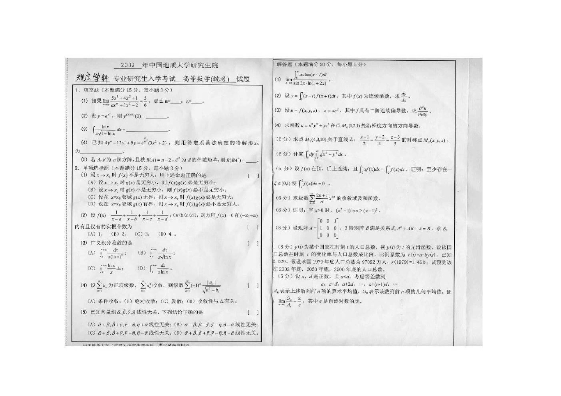 当前位置:考研云分享 专业课真题 2002年中国地质大学(北京)610高等数学考研真题 附件 文件名: 2002年中国地质大学(北京)610高等数学考研真题.docx 文件类型: docx 前往下载 附件购买 售价:98 积分 开通会员或更高级的会员可免费下载该文件 您还未登录,请登录后查看资料 登录 中国地质大学高等数学 中国地质大学 高等数学 免责声明:本站所有的内容均来源于互联网采集或网友投稿提供,不能保证内容的真实性、完整性,仅供个人研究、交流学习使用,不涉及任何商业盈利目的。如果资料有误与官方发布不一致,请与官方最新发布为准,请联系本站管理员予以更改,如果涉及版权等问题,请联系本站管理员予以删除。 维权指引 | 权限说明 | 下载说明 | 内容投诉考研云分享 » 2002年中国地质大学(北京)610高等数学考研真题