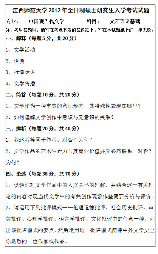 当前位置:考研云分享 专业课真题 2012年江西师范大学715文艺理论基础考研真题 江西师范大学文艺理论基础 江西师范大学 文艺理论基础 免责声明:本站所有的内容均来源于互联网采集或网友投稿提供,不能保证内容的真实性、完整性,仅供个人研究、交流学习使用,不涉及任何商业盈利目的。如果资料有误与官方发布不一致,请与官方最新发布为准,请联系本站管理员予以更改,如果涉及版权等问题,请联系本站管理员予以删除。 维权指引 | 权限说明 | 下载说明 | 内容投诉考研云分享 » 2012年江西师范大学715文艺理论基础考研真题