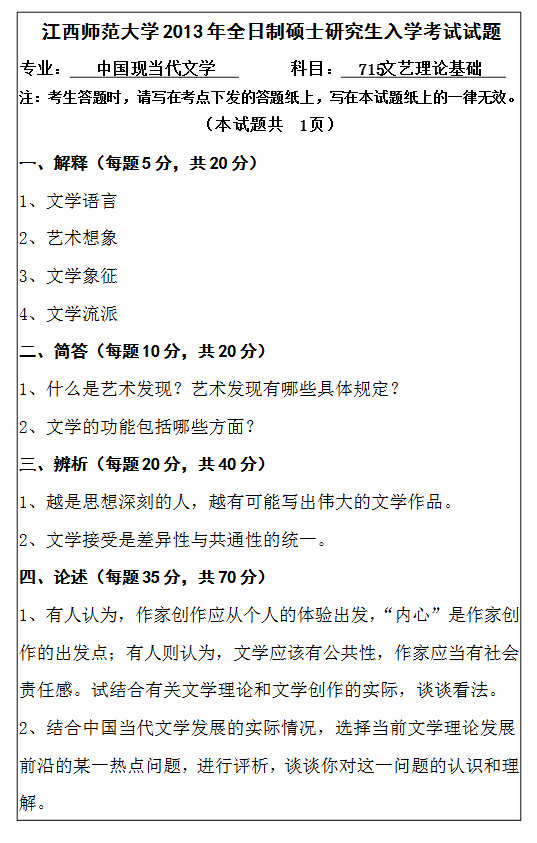 当前位置:考研云分享 专业课真题 2013年江西师范大学715文艺理论基础考研真题 江西师范大学文艺理论基础 江西师范大学 文艺理论基础 免责声明:本站所有的内容均来源于互联网采集或网友投稿提供,不能保证内容的真实性、完整性,仅供个人研究、交流学习使用,不涉及任何商业盈利目的。如果资料有误与官方发布不一致,请与官方最新发布为准,请联系本站管理员予以更改,如果涉及版权等问题,请联系本站管理员予以删除。 维权指引 | 权限说明 | 下载说明 | 内容投诉考研云分享 » 2013年江西师范大学715文艺理论基础考研真题