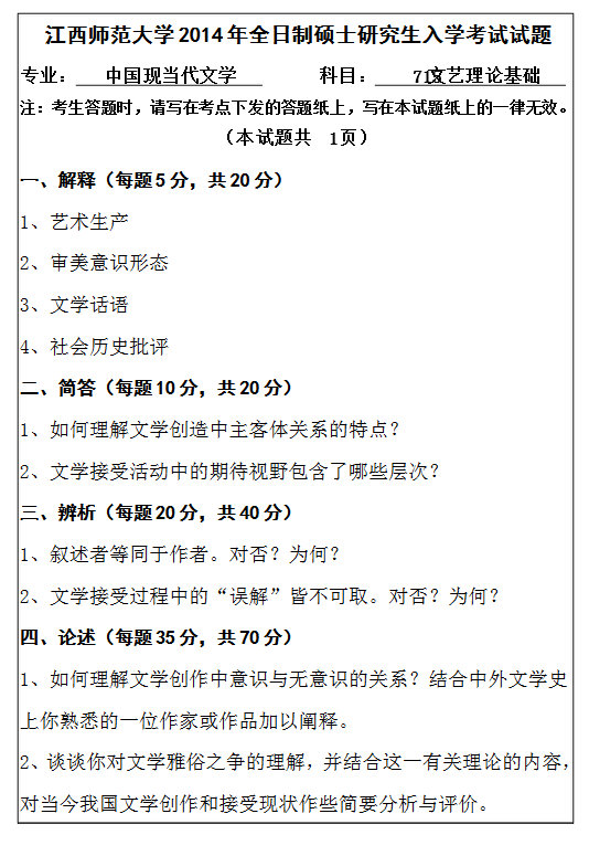 当前位置:考研云分享 专业课真题 2014年江西师范大学715文艺理论基础考研真题 江西师范大学文艺理论基础 江西师范大学 文艺理论基础 免责声明:本站所有的内容均来源于互联网采集或网友投稿提供,不能保证内容的真实性、完整性,仅供个人研究、交流学习使用,不涉及任何商业盈利目的。如果资料有误与官方发布不一致,请与官方最新发布为准,请联系本站管理员予以更改,如果涉及版权等问题,请联系本站管理员予以删除。 维权指引 | 权限说明 | 下载说明 | 内容投诉考研云分享 » 2014年江西师范大学715文艺理论基础考研真题