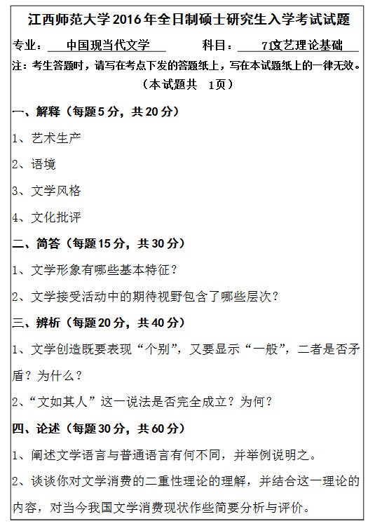 当前位置:考研云分享 专业课真题 2016年江西师范大学715文艺理论基础考研真题 江西师范大学文艺理论基础 江西师范大学 文艺理论基础 免责声明:本站所有的内容均来源于互联网采集或网友投稿提供,不能保证内容的真实性、完整性,仅供个人研究、交流学习使用,不涉及任何商业盈利目的。如果资料有误与官方发布不一致,请与官方最新发布为准,请联系本站管理员予以更改,如果涉及版权等问题,请联系本站管理员予以删除。 维权指引 | 权限说明 | 下载说明 | 内容投诉考研云分享 » 2016年江西师范大学715文艺理论基础考研真题