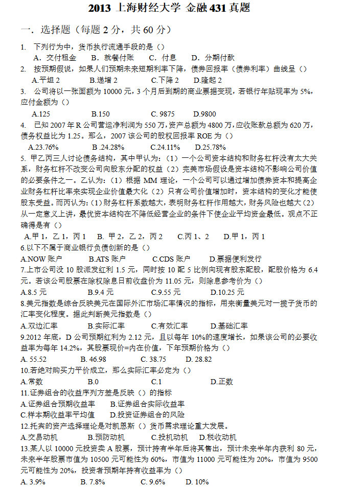 2013年上海财经大学431金融学综合考研真题及答案.pdf