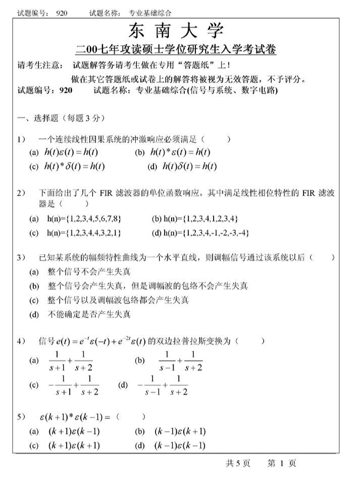内容投诉考研云分享 » 2007年东南大学920专业基础综合(信号与系统、数字电路)考研真题