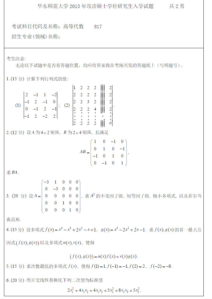 当前位置:考研云分享 专业课真题 2013年华东师范大学817高等代数考研真题 附件 文件名: 2013年华东师范大学高等代数考研真题.docx 文件类型: docx 前往下载 附件购买 售价:98 积分 开通会员或更高级的会员可免费下载该文件 您还未登录,请登录后查看资料 登录 华东师范大学高等代数 华东师范大学 高等代数 免责声明:本站所有的内容均来源于互联网采集或网友投稿提供,不能保证内容的真实性、完整性,仅供个人研究、交流学习使用,不涉及任何商业盈利目的。如果资料有误与官方发布不一致,请与官方最新发布为准,请联系本站管理员予以更改,如果涉及版权等问题,请联系本站管理员予以删除。 维权指引 | 权限说明 | 下载说明 | 内容投诉考研云分享 » 2013年华东师范大学817高等代数考研真题