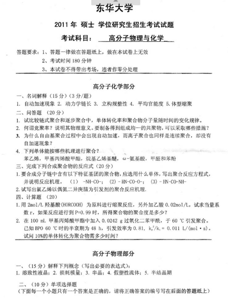 当前位置:考研云分享 专业课真题 2011年东华大学高分子物理及化学考研真题 附件 文件名: 2011年东华大学高分子物理及化学考研真题.docx 大小: 486.00KB 文件类型: .docx 前往下载 附件购买 售价:98 积分 开通会员或更高级的会员可免费下载该文件 您还未登录,请登录后查看资料 登录 东华大学高分子物理及化学 东华大学 高分子物理及化学 免责声明:本站所有的内容均来源于互联网采集或网友投稿提供,不能保证内容的真实性、完整性,仅供个人研究、交流学习使用,不涉及任何商业盈利目的。如果资料有误与官方发布不一致,请与官方最新发布为准,请联系本站管理员予以更改,如果涉及版权等问题,请联系本站管理员予以删除。 维权指引 | 权限说明 | 下载说明 | 内容投诉考研云分享 » 2011年东华大学高分子物理及化学考研真题