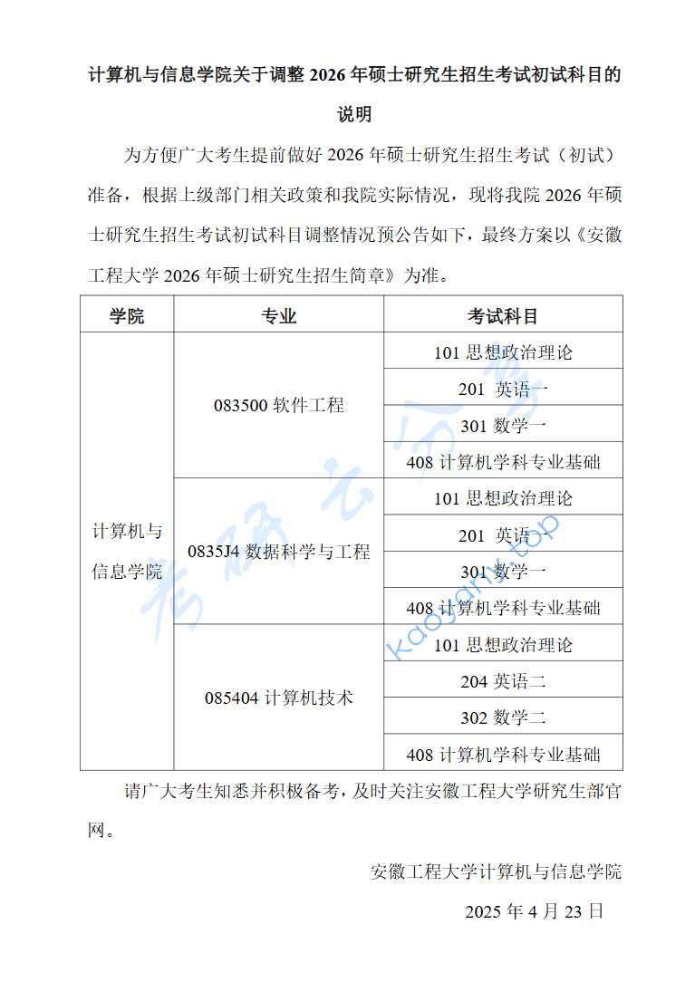 当前位置:考研云分享 研招信息 2026年安徽工程大学科目调整 计算机与信息学院关于调整2026年硕士研究生招生考试初试科目的说明 安徽工程大学 免责声明:本站所有的内容均来源于互联网采集或网友投稿提供,不能保证内容的真实性、完整性,仅供个人研究、交流学习使用,不涉及任何商业盈利目的。如果资料有误与官方发布不一致,请与官方最新发布为准,请联系本站管理员予以更改,如果涉及版权等问题,请联系本站管理员予以删除。 维权指引 | 权限说明 | 下载说明 | 内容投诉考研云分享 » 2026年安徽工程大学科目调整