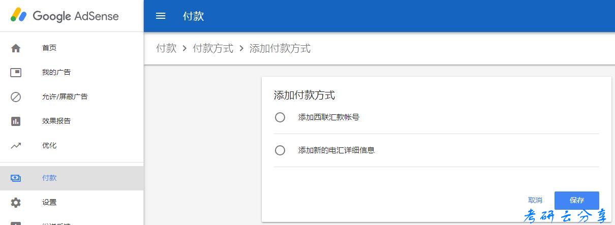 1、登录 Google Adsense 后台,点击左侧“付款”按钮,在“您如何获得付款”中点击“添加付款方式”链接按钮。具体如下图所示: