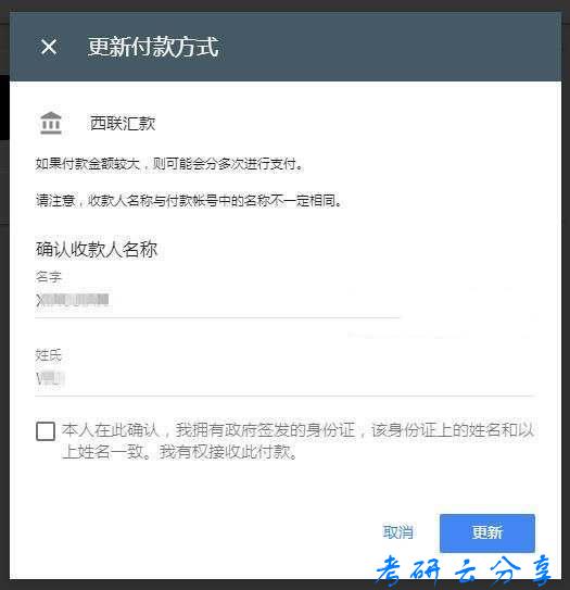 在修改页面,我们就可以修改姓名等信息,修改之后记得勾选“本人在此确认,我拥有政府签发的身份证,该身份证上的姓名和以上姓名一致,我有权接收此付款”,最后点击『更新』按钮即可成功修改西联汇款的收款人信息。