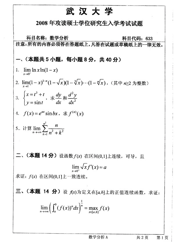 当前位置:考研云分享 专业课真题 2008年武汉大学633数学分析考研真题 积分抵扣 售价:98 积分 开通会员或更高级的会员可免费查看该内容 您还未登录,请登录后查看资料 登录 武汉大学数学分析 武汉大学 数学分析 免责声明:本站所有的内容均来源于互联网采集或网友投稿提供,不能保证内容的真实性、完整性,仅供个人研究、交流学习使用,不涉及任何商业盈利目的。如果资料有误与官方发布不一致,请与官方最新发布为准,请联系本站管理员予以更改,如果涉及版权等问题,请联系本站管理员予以删除。 维权指引 | 权限说明 | 下载说明 | 内容投诉考研云分享 » 2008年武汉大学633数学分析考研真题