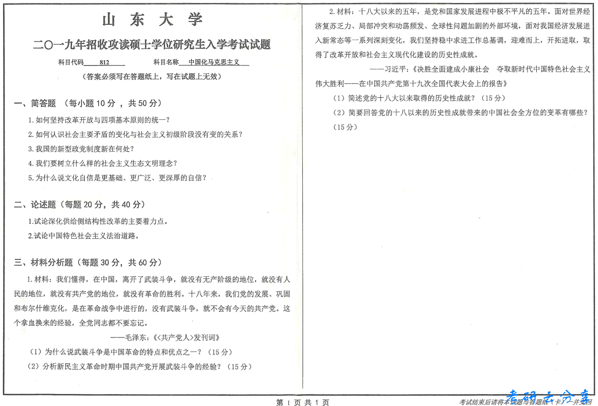 2025年山东大学812中国化马克思主义考研真题 山东大学中国化马克思主义 山东大学 中国化马克思主义 一、简答题1、新民主主义革命的总路线2、对农业的社会主义改造的经验3、社会主义建设道路初步探索的理论成果4、全过程人民民主的本质属性5、人民立场是中国共产党的根本政治立场二、论述题1、构建新发展格局的必然性2、全面深化改革是一场深刻的革命三、材料题1、(1)走中国工业化道路的必然性和主要内容(2)走中国工业化道路的要求2、(1)为什么文化繁荣兴盛是中华民族伟大复兴的必然要求