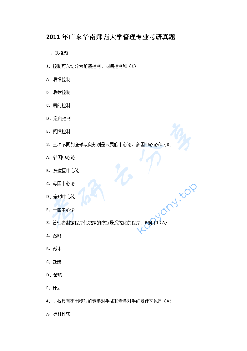 会员免费 2021年华南师范大学827管理学考研真题 华南师范大学管理学 华南师范大学 管理学 2021年华南师范大学827管理学(回忆版)一、名词解释1. 概念技能2. 系统管理理论3. 组织变革4. 战略领导者5. 头脑风暴法6. 前馈控制(此题不详)