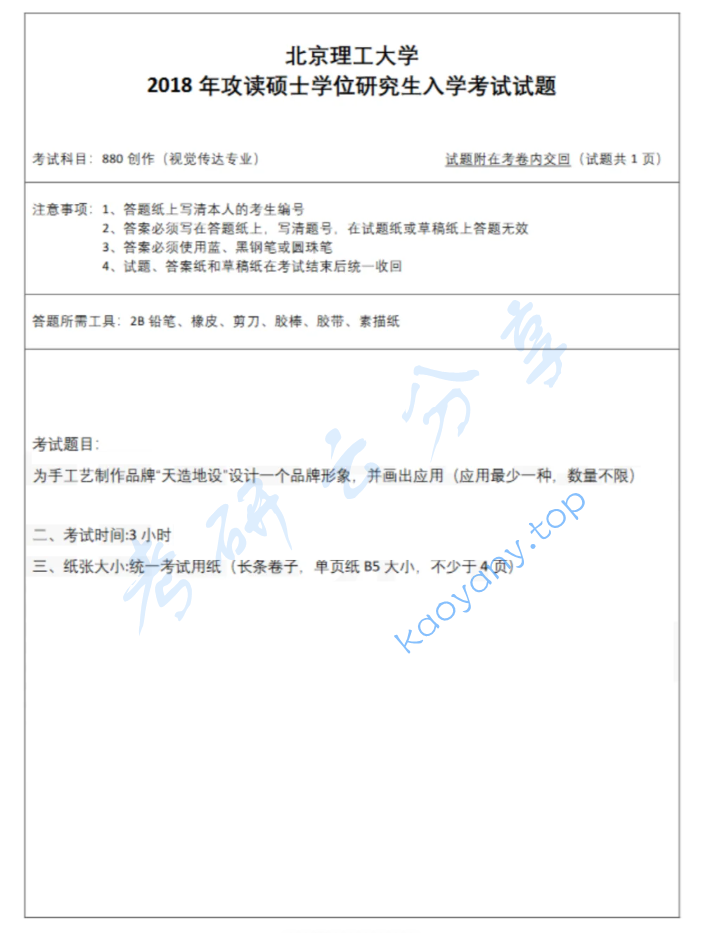 2024年北京理工大学880创作(艺术创新设计及理论)考研真题 北京理工大学创作 北京理工大学 创作 考试题目:请绘制结合一个中国传统民俗活动,或与其相关的器物或者纹样绘制一个文创产品。要求:画出三个草图(60分)选取一个表现效果图(70分)设计说明不超过 300 字(20分)二、考试时间:3 小时三、纸张大小:统一考试用纸(长条卷子,单页纸 B5大小,不少于4页)
