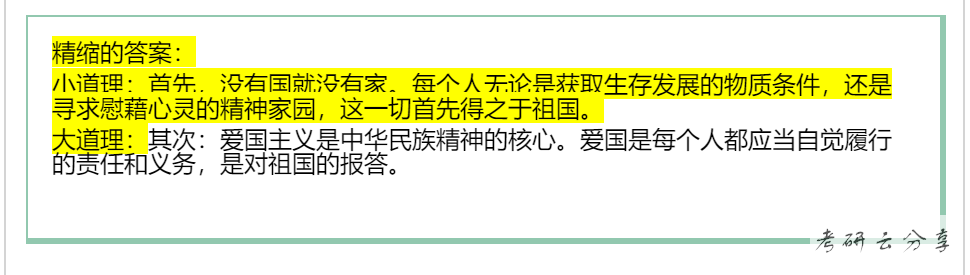 肖秀荣:四套卷简化背诵思路模板篇笔记之思修篇 肖秀荣 肖4 《肖秀荣四套卷》思修法基(第37题) 【第一套】材料一:爱国是人间最深层次、最持久的情感,爱国是第一位的。材料二:以王继才夫妇先进事迹为例,突显爱国情感。材料三:以卓嘎和央宗姐妹为例,突显爱国情感。【题1】为什么说爱国是第一位的?(或如何理解爱国是人间最深层次、最持久的情感?)[背诵答案]1. 每个人生存发展的物质条件和精神慰藉都得益于祖国。2. 爱国主义体现了人们对自己祖国的深厚情感,是人们对自己家园以及民族和文化的归属感,认同感,尊严感与荣誉感的统一。3.&nb