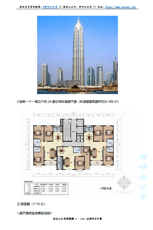 会员免费 2014年南京大学355建筑学基础考研真题 南京大学建筑学基础 南京大学 建筑学基础 一、名词解释1.用地红线2.全面(总体?)城市设计3.建筑高度二、简答题;1.看图说说城市肌理:2.建筑面积与建筑”套内“使用面积区别。三、论述题:1.结合葡萄牙建筑师西扎的建筑谈谈文脉与场所精神。2.结合西班牙建筑师的建筑谈谈建筑与光线。四、构造外墙构造五、作图一梯四户的高层住宅布置楼梯问,要求包含楼梯,门窗,电梯。