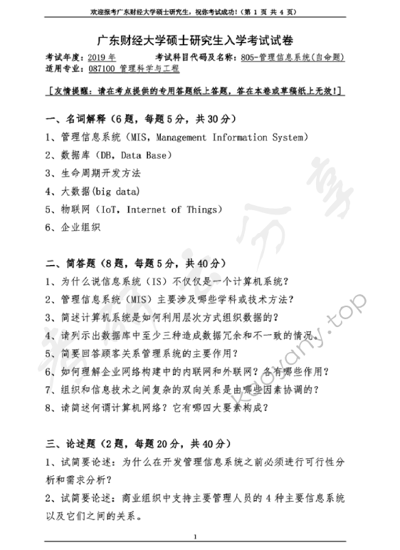 会员免费 2021年武汉理工大学943管理信息系统考研真题 武汉理工大学管理信息系统 武汉理工大学 管理信息系统 943 管理信息系统一、 名词解释 (20分)1.信息:是对事物运动状态和特征的描述,是经过加工处理以后能对接受者的行为产生影响的数据。2.管理信息系统:是一个以人为主导、以科学的管理理论为指导,在科学的管理制度的基础上,利用计算机硬件、软件、网络通信设备以及其他办公设备进行信息的收集、传输、加工、存储、更新和维护,以提高企业的竞争优势,改善企业的效益和效率为目的,支持企业高层决策、中层控制、基层作业的集成化的人机系统。(是一个管理系统和社会系统)3.