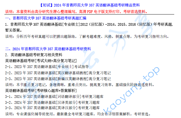 西南林业大学357翻译基础(英语)考研真题暂无初试参考书冯庆华,《实用翻译教程英汉互译》(第3版),上海外语教育出版社,2020.邓炎昌、刘润清,《语言与文化一一英汉语言文化对比》(新版),外语教学与研究出版社,2018.全国翻译硕士专业学位教育指导委员会,《翻译硕士专业学位(MTI)入学考试全国联考指南》,外语教学与研究出版社,2008.Eugene A.Nida&Charles R.Taber,The Theory and Practice of Translation,上海外语教育出版社,2004.