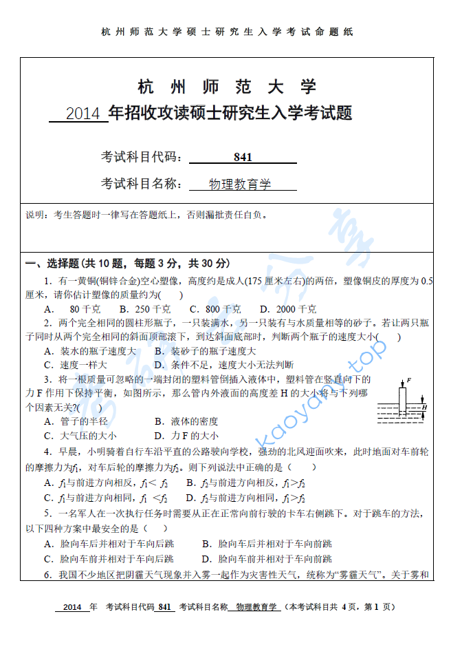 2014年杭州师范大学841物理教育学考研真题.pdf