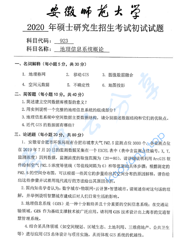 2014一. 填空题(1分*70)1.地理信息系统简称( ),英文全称通常为( )。2.一个地理信息系统的基本构成包括以下5个主要部分,按照重要性由小到大排列,依次是:( ),( ),( ),( ),( )3.地理信息的特征可以归纳为以下三点:( )特征、( )特征、( )特征。4.地理信息系统主要的数据输入设备有:( )仪、( )仪、( )设备。5.GIS的矢量数据用x,y坐标和( )、( )、( )等简单几何对象来表示空间要素。地理信息系统最主要的两种数据结构是( )数据结构和( )数据结构。